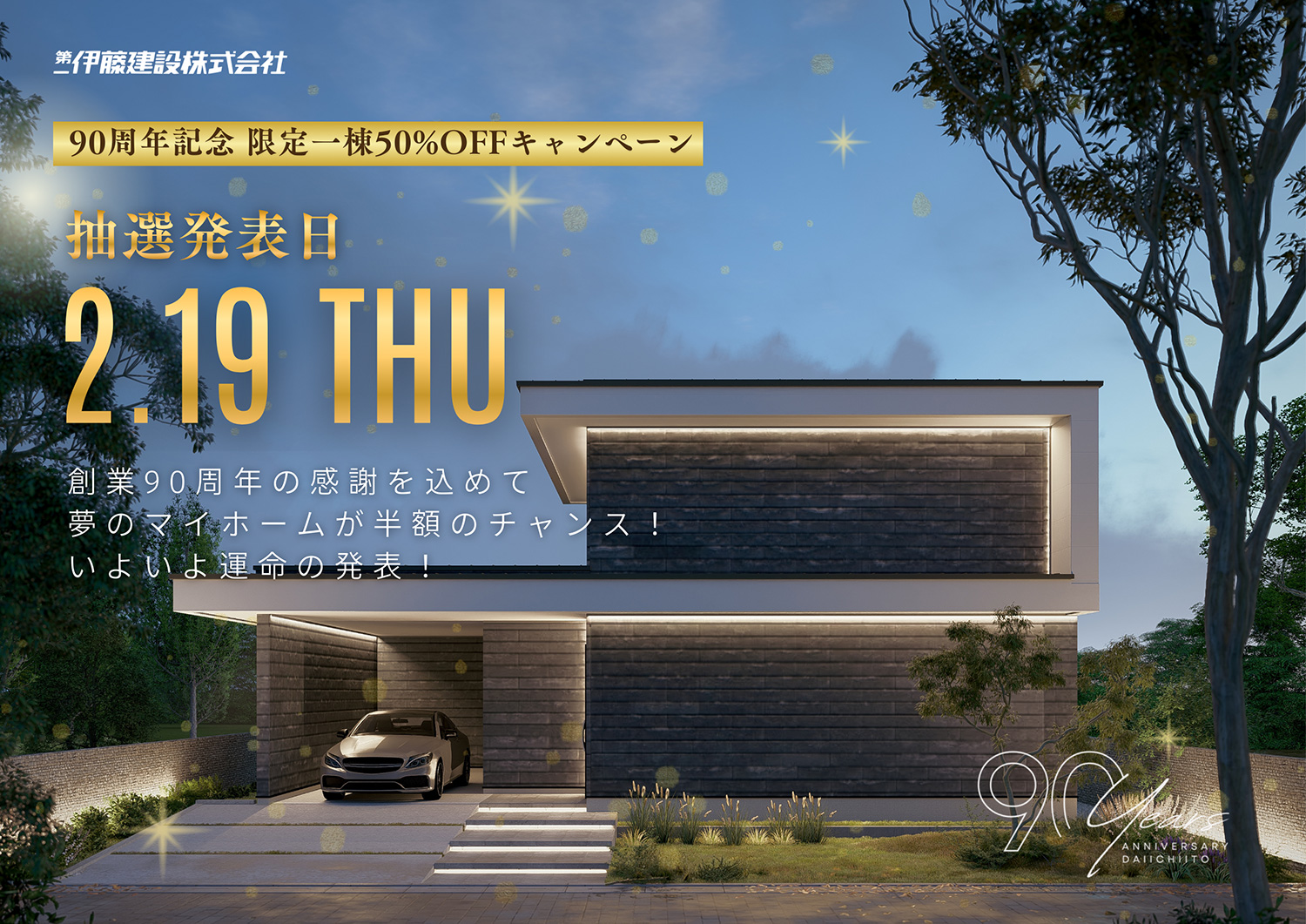 このたび実施いたしました創業90周年記念「限定1棟・50%OFFキャンペーン」に、大変多くのご応募をいただき誠にありがとうございました。厳正なる抽選の結果、当選者が決定いたしましたのでお知らせいたします。