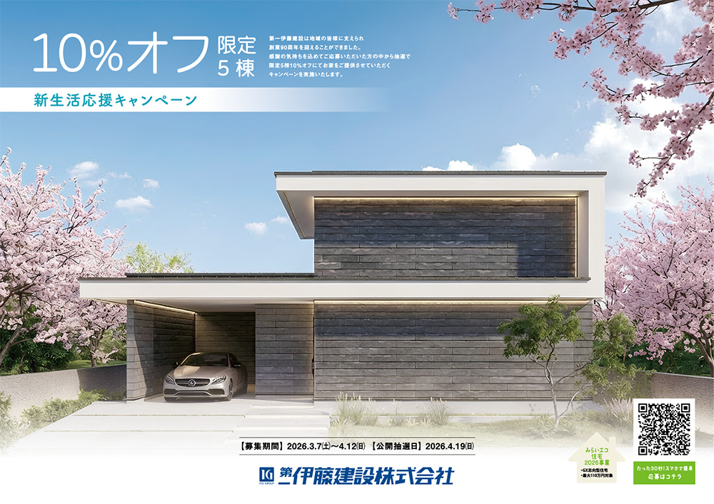 日頃のご愛顧に感謝を込めまして、ご応募いただいた方の中から抽選で「限定5棟」を通常価格から10%オフにてご提供する「新生活応援キャンペーン」を実施いたします。