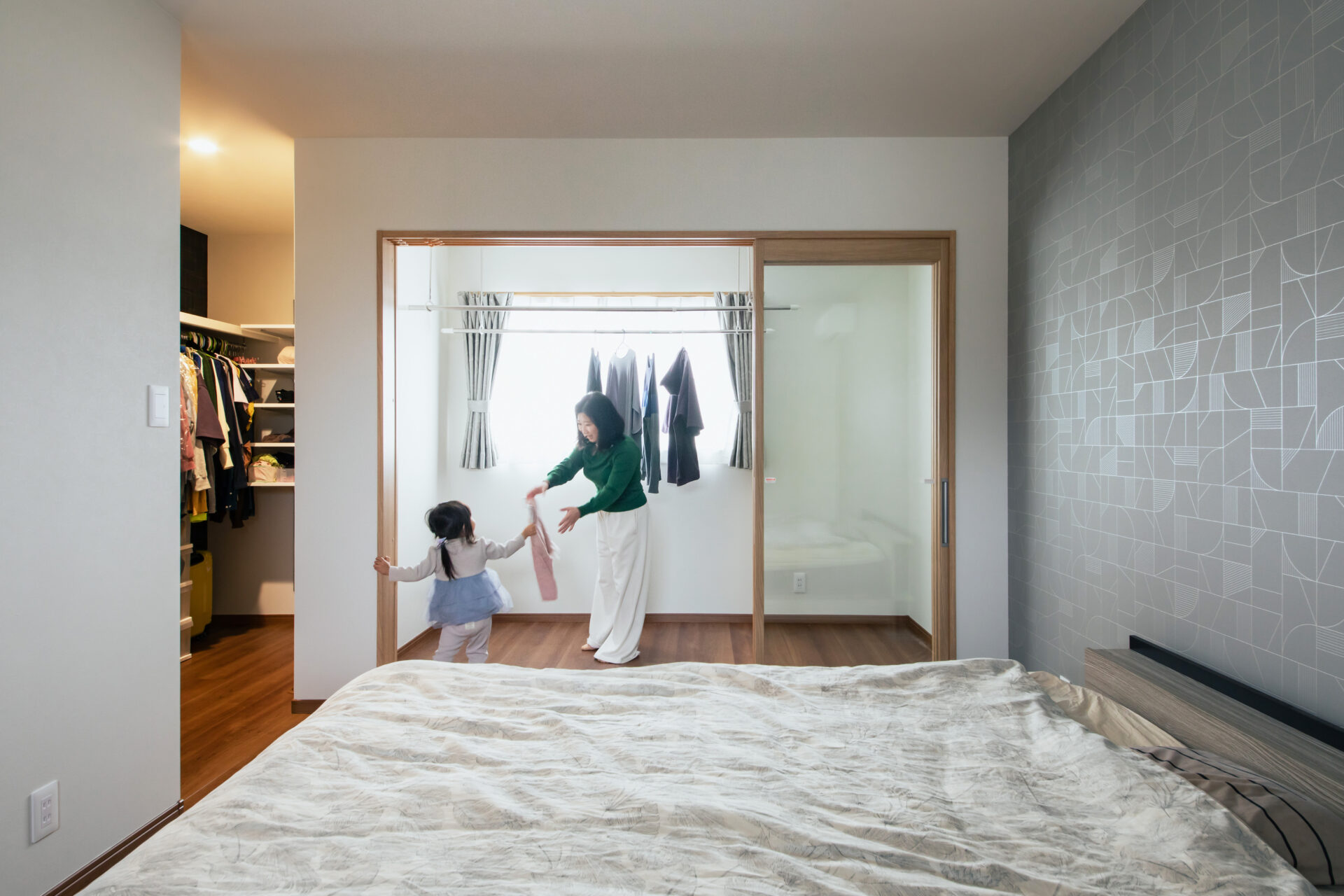 日差しが入るような建具で仕切ることができる、室内干しスペースを設けた寝室。ウォークインクローゼットもあって、片付けの家事動線がスムーズです。