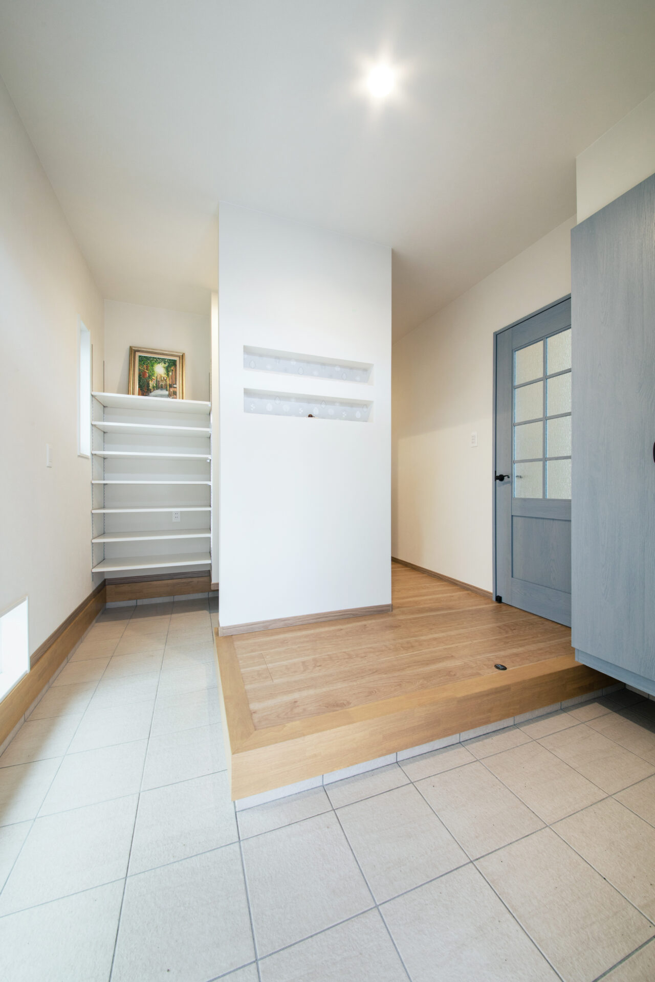 2WAYの動線の間取りになっている玄関。土間で続いていて、オープンな棚の横には、ハンガーパイプを取り付けてあってクロークのように使えます。