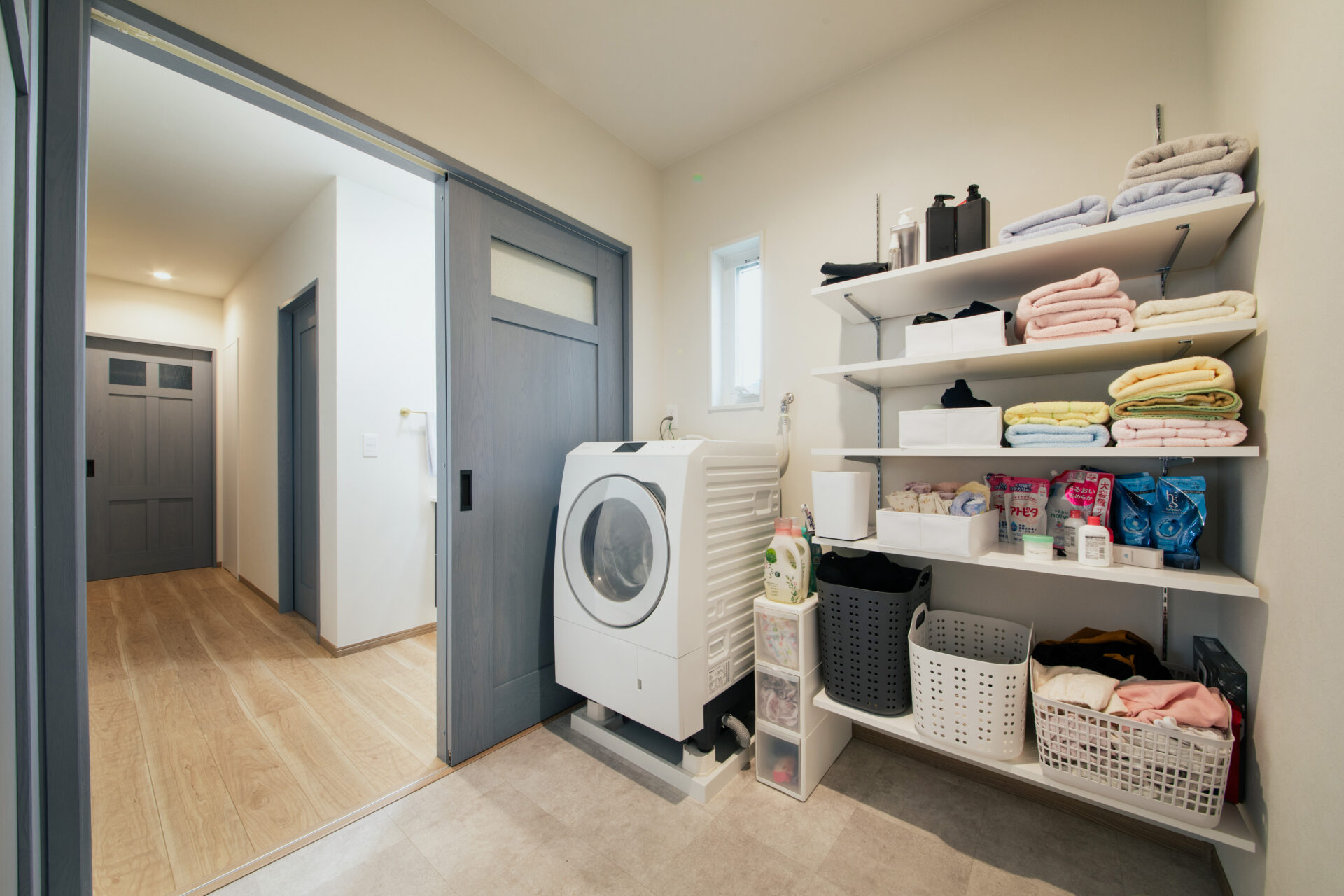 オープンな棚がある脱衣スペース。洗面とは切り離して、プライベートな使い方ができる間取りです。