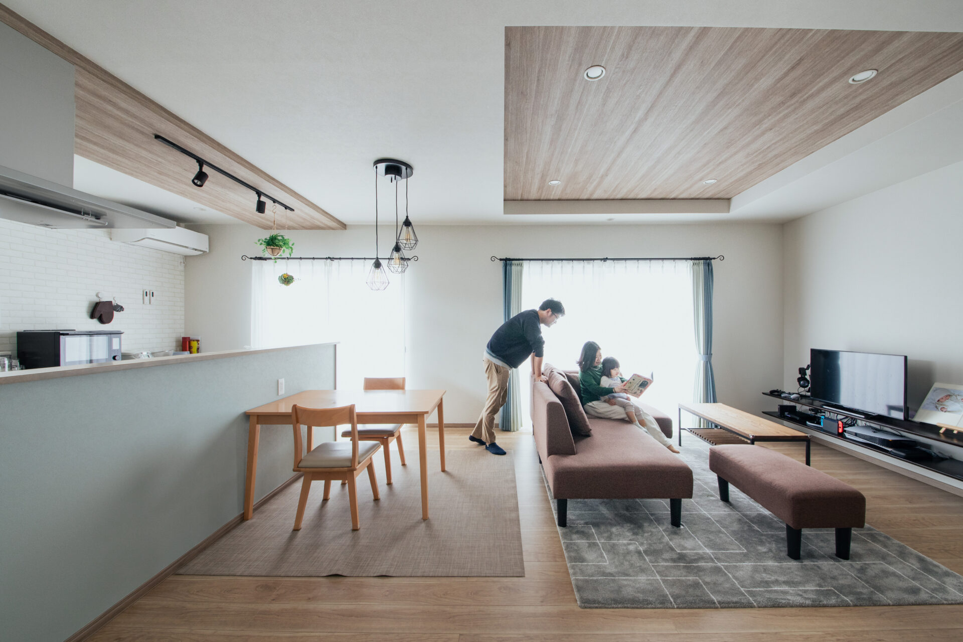 木目調のアクセントクロスで仕上げた折り上げ天井。モデルハウスのデザインを参考にしています。