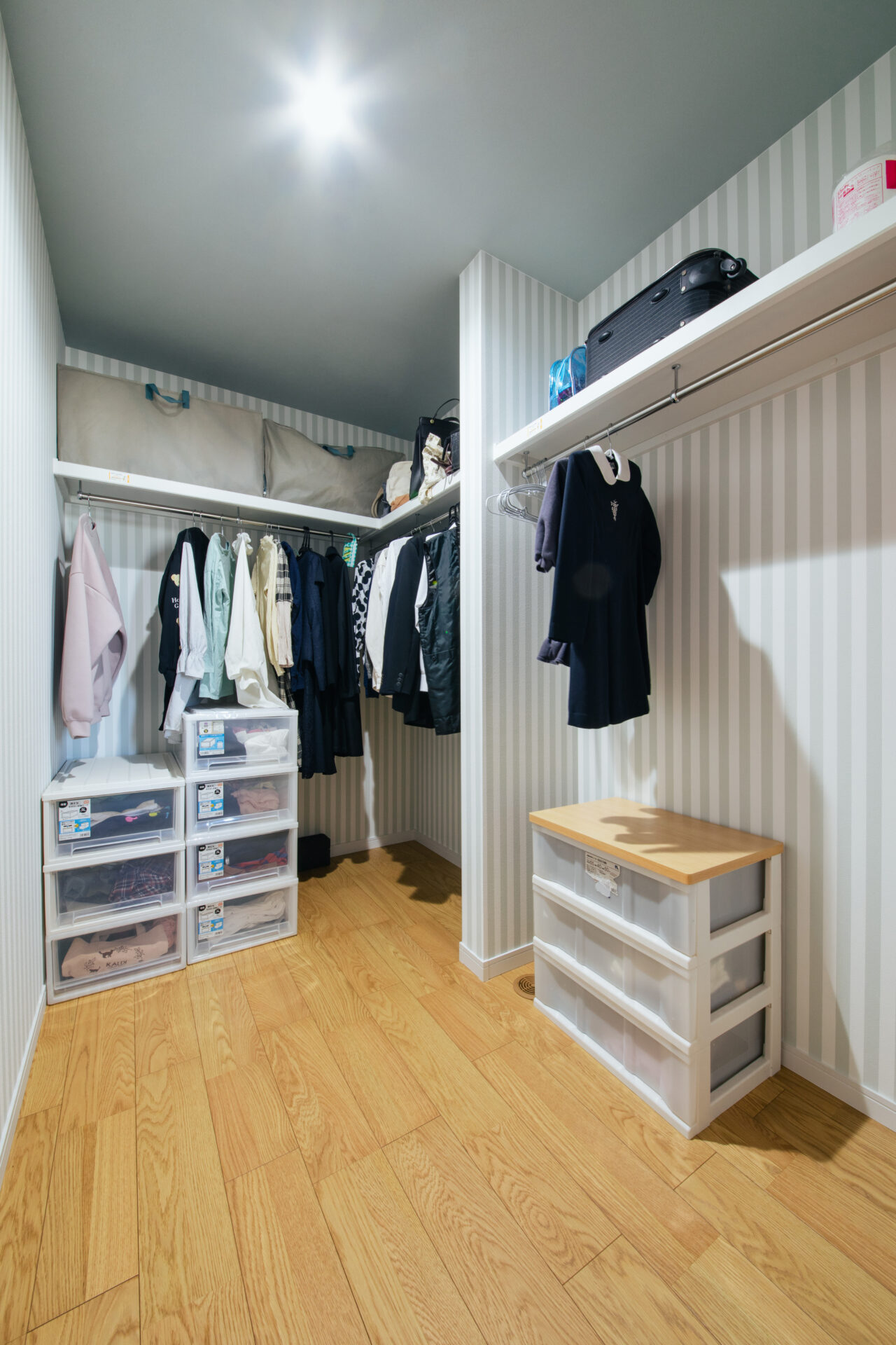 お客様お気に入りの壁紙で仕上げたファミリークローゼット。