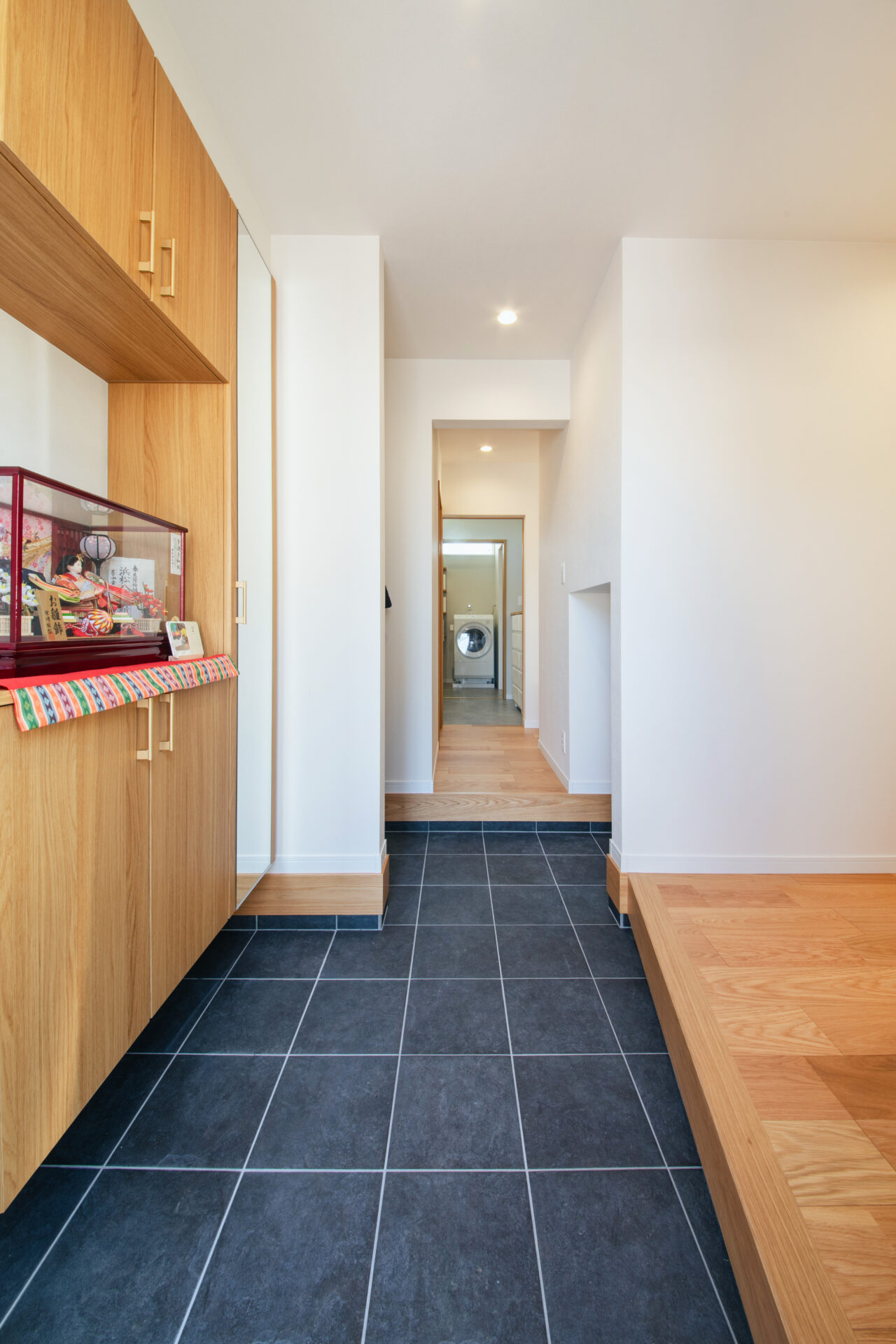 2WAY動線の玄関スペース。リビングと洗面スペースへの入り口があります。