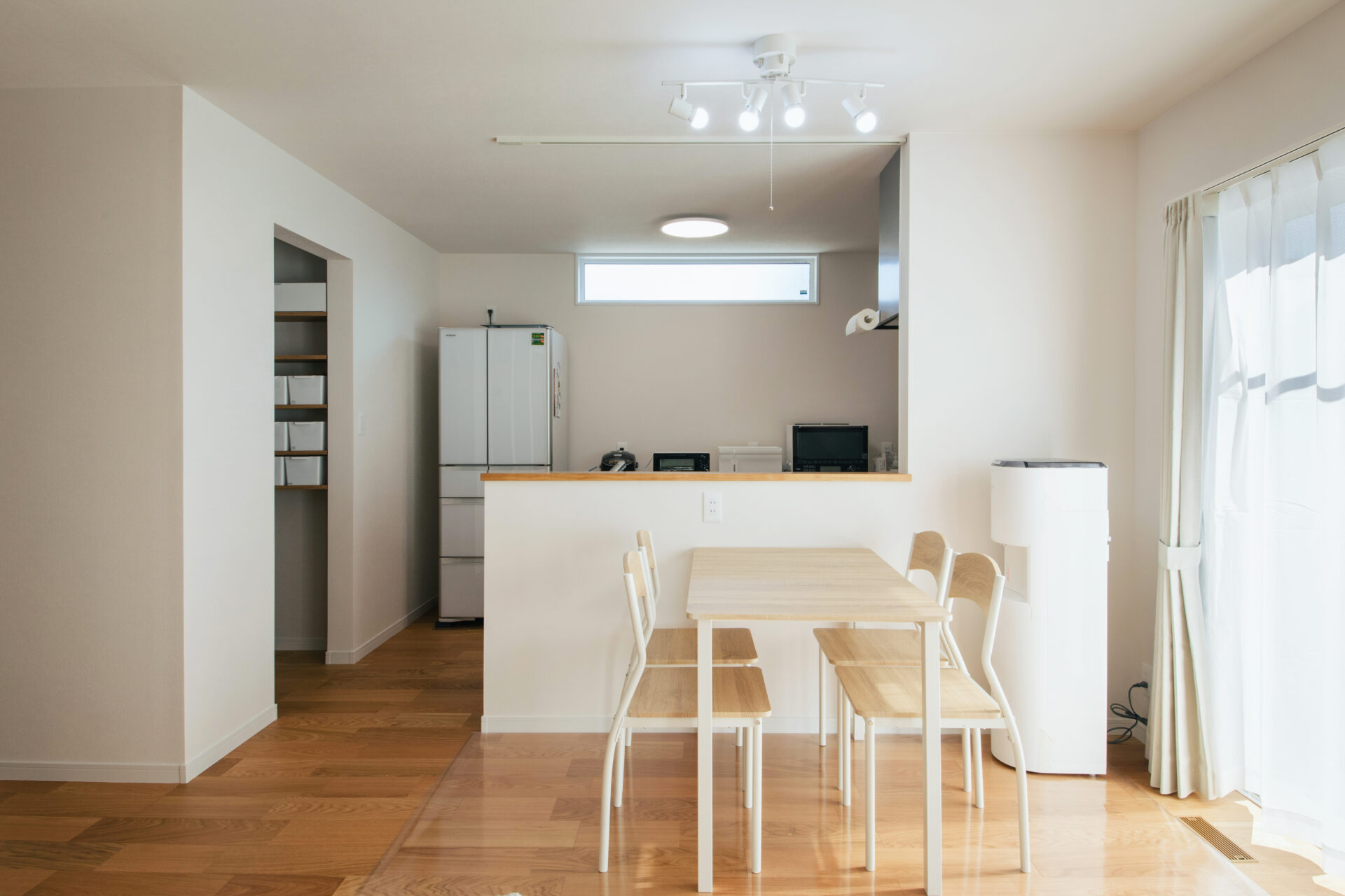 南側に大きな掃き出し窓を設けて、日差しがたっぷり入る明るいLDK。白を基調にした壁紙で仕上げたナチュラルインテリアな空間。