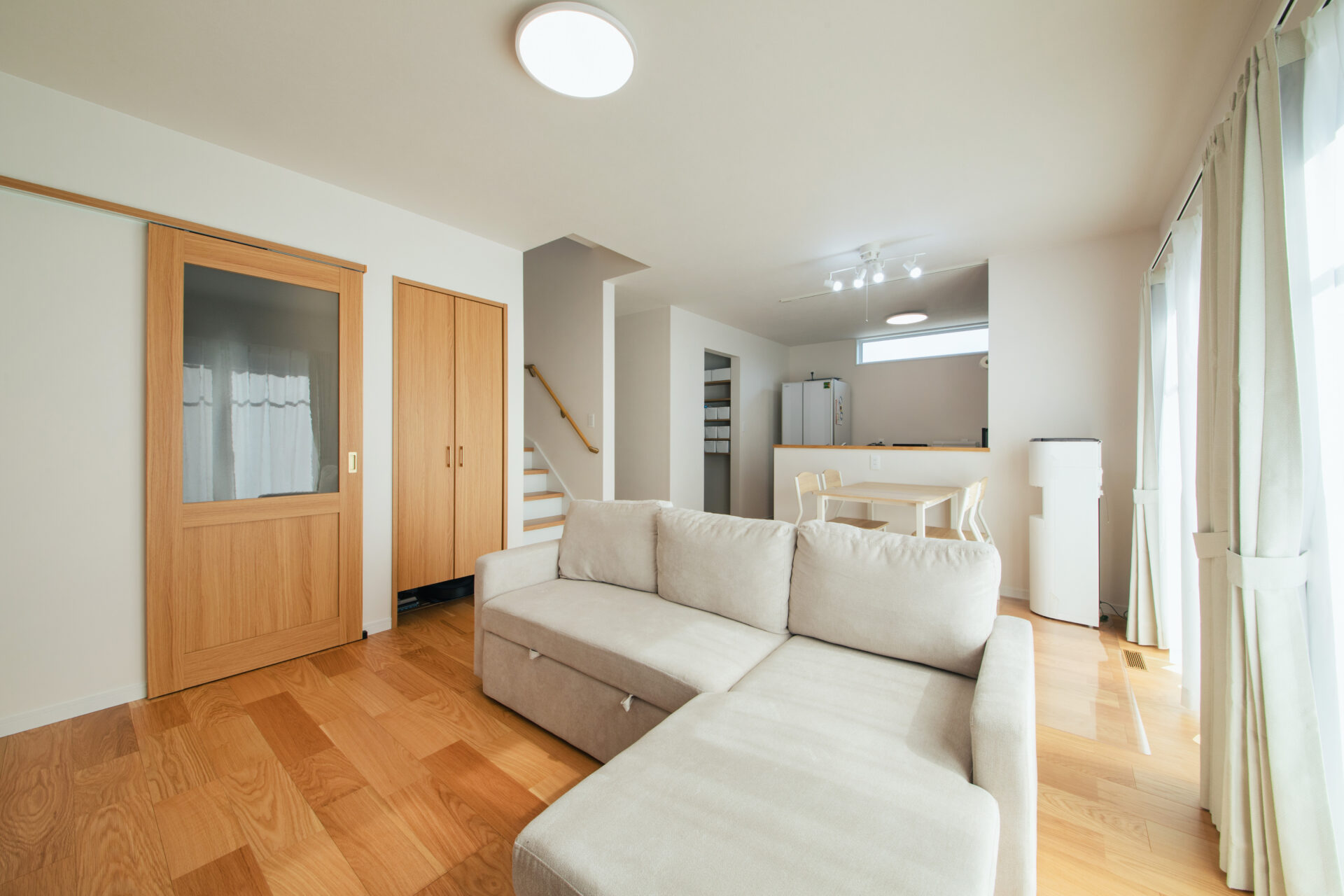 インテリアに合わせてお客様が選んだソファが馴染むリビング。木目の引き戸や床材から温もりも感じられる。