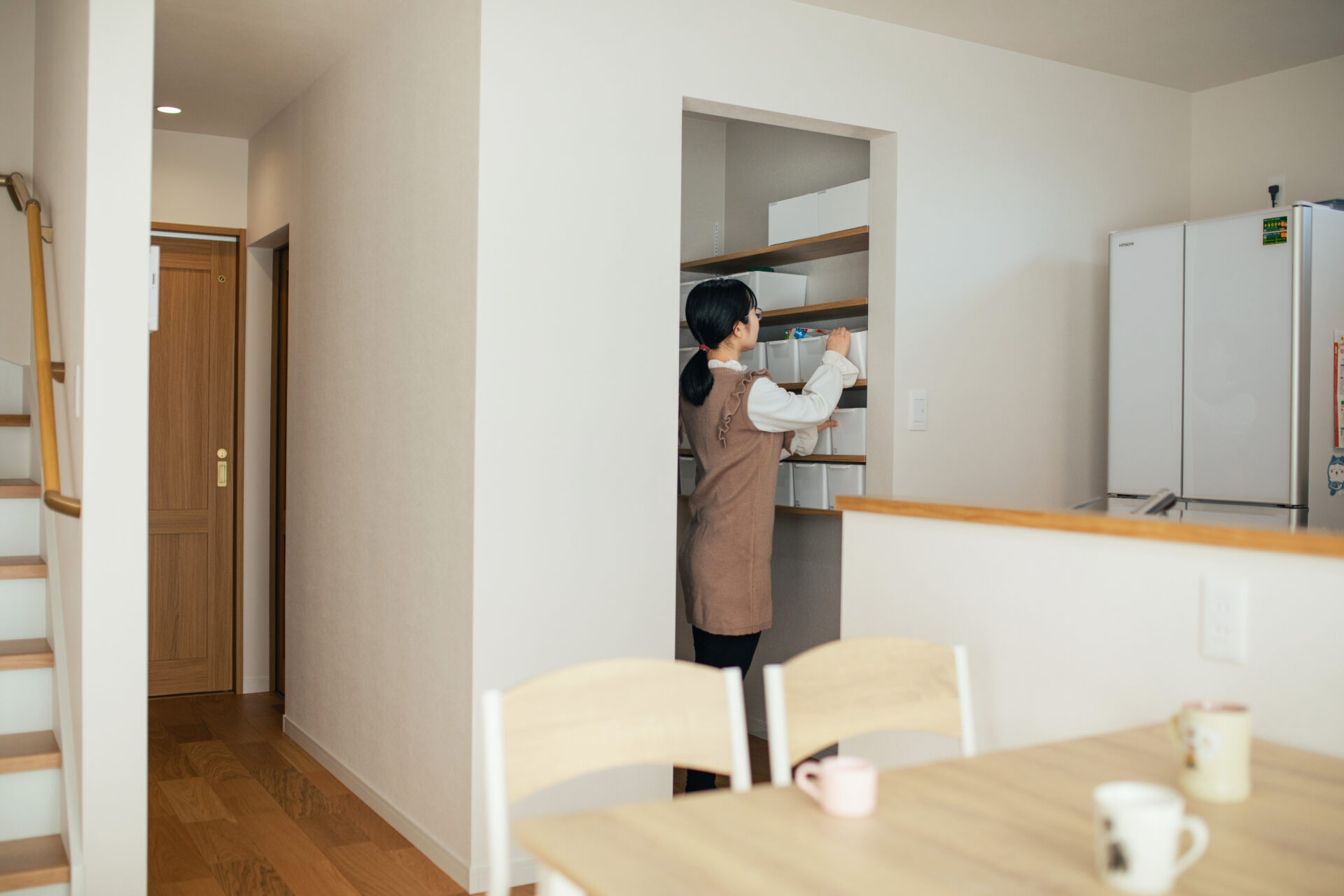 キッチン横のパントリーはたっぷりの収納量。奥様が調べて準備した収納ボックスで整理整頓されていて、日常生活に大活躍。