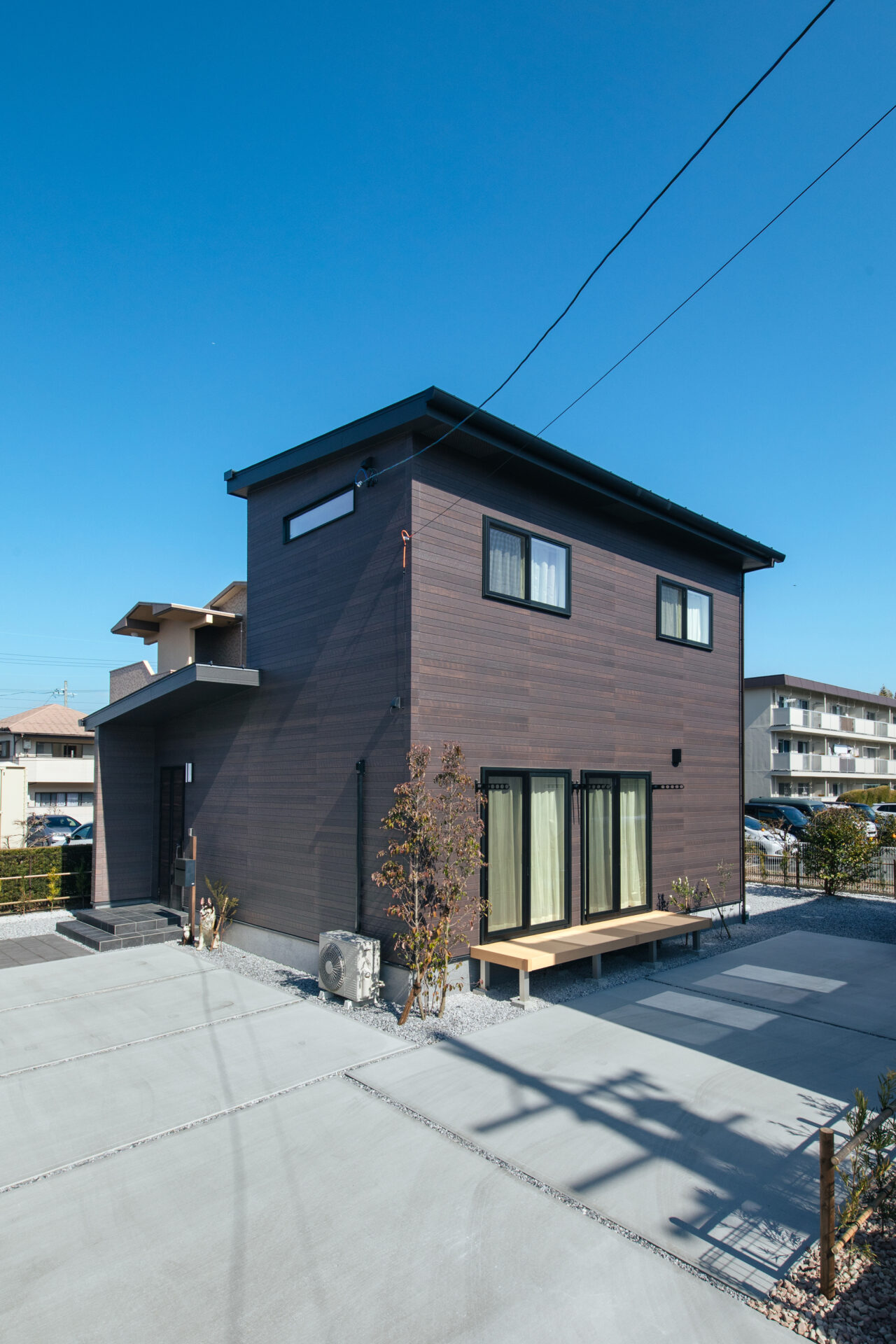 外観は引き締まった焦茶の外壁で、奥様が好きなカフェのイメージでコーディネート。