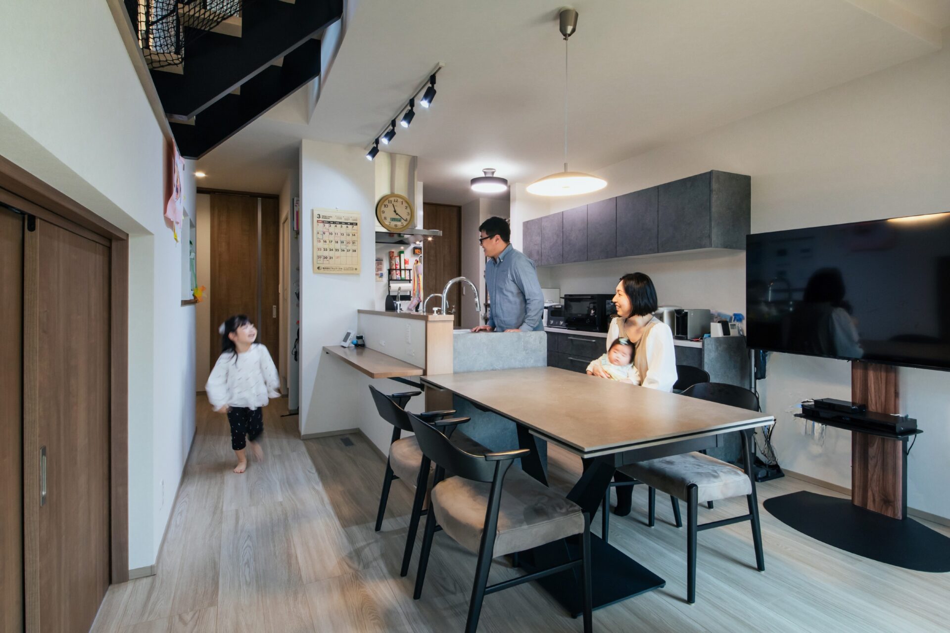 建築したのは、もともと奥様のご実家があった場所。古い家を取り壊し、奥様のご両親との同居のために二世帯住宅を新築されました。親世帯は平屋、子世帯はスキップフロアのある間取りで玄関ホールでつながっています。子世帯のダイニングは、スキップフロアに設けたリビングとつながり明るい雰囲気に。リビングの下は、収納などに使える多目的なスペースです。