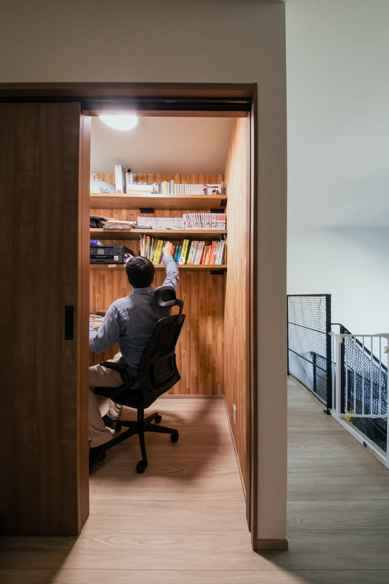 念願だったご主人の書斎スペース。使い勝手いに合わせて、机や棚を取り付けました。