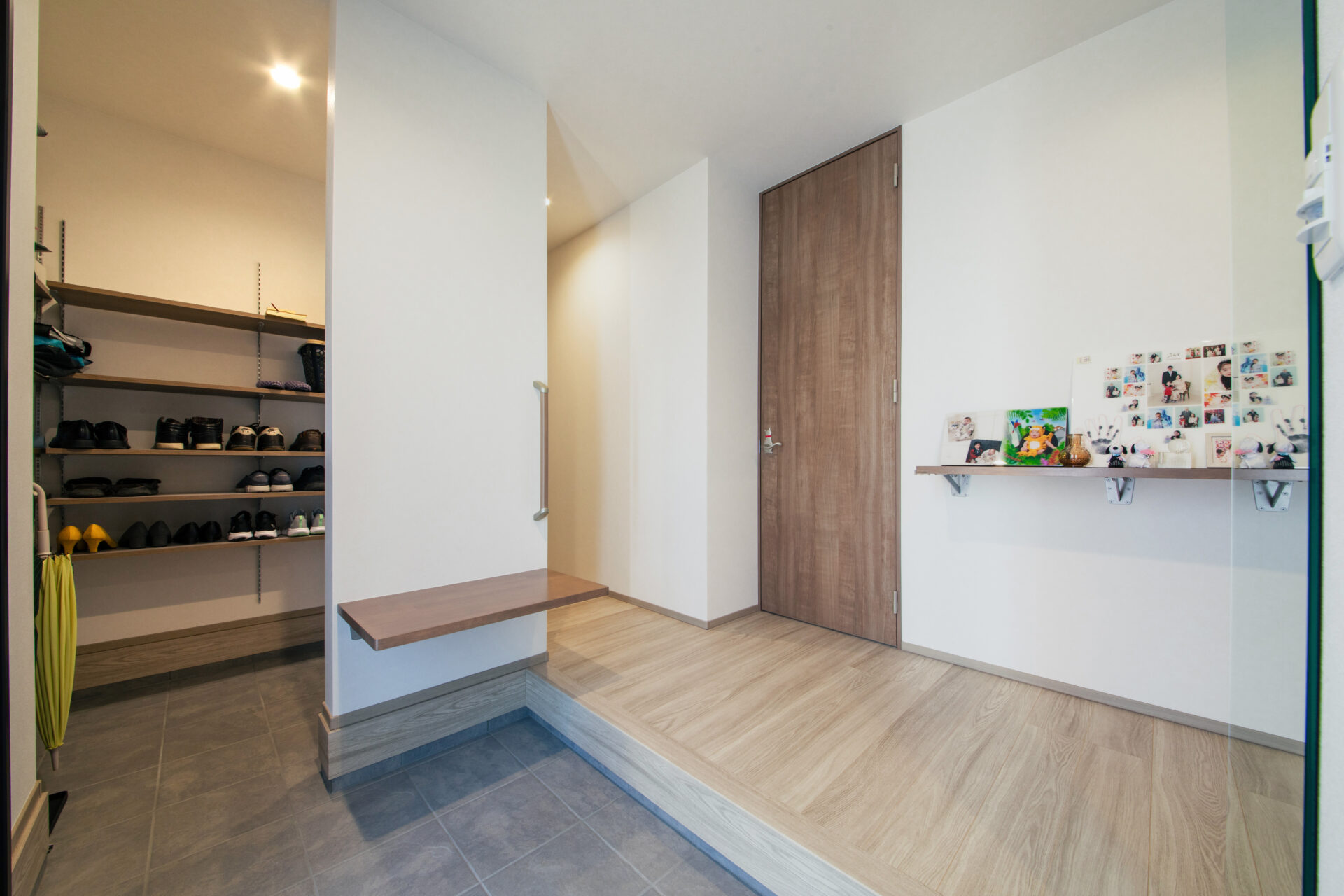 二世帯みんなで使う共通の玄関。シューズクロークをぞれぞれ設けました。壁によって動線が別れるように設計しています。