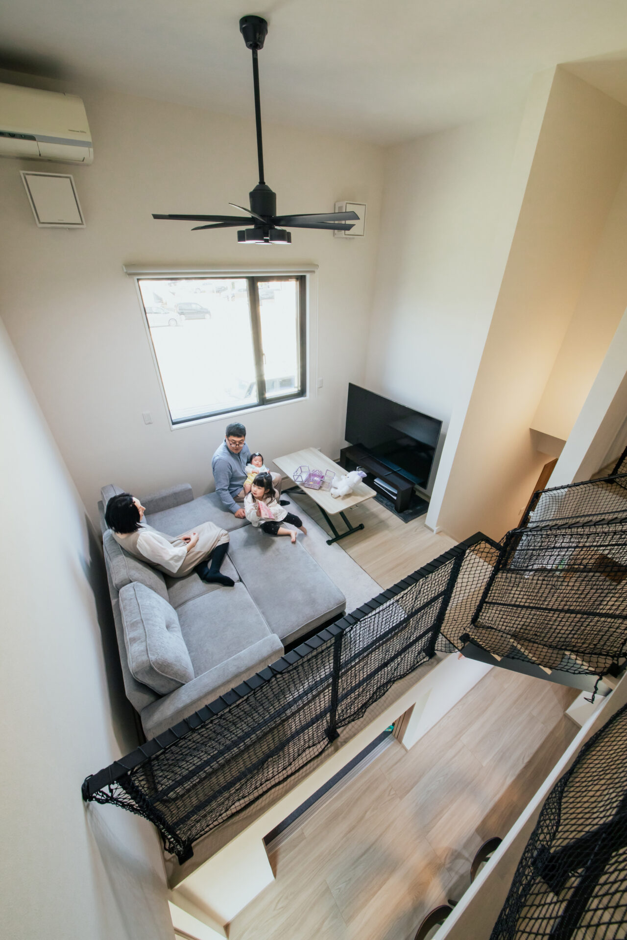 リビングはスキップフロア部分に設けたため独立したスペースに。天井の高さやアイアンの手すりで抜け感があり、開放感をたっぷり感じられます。