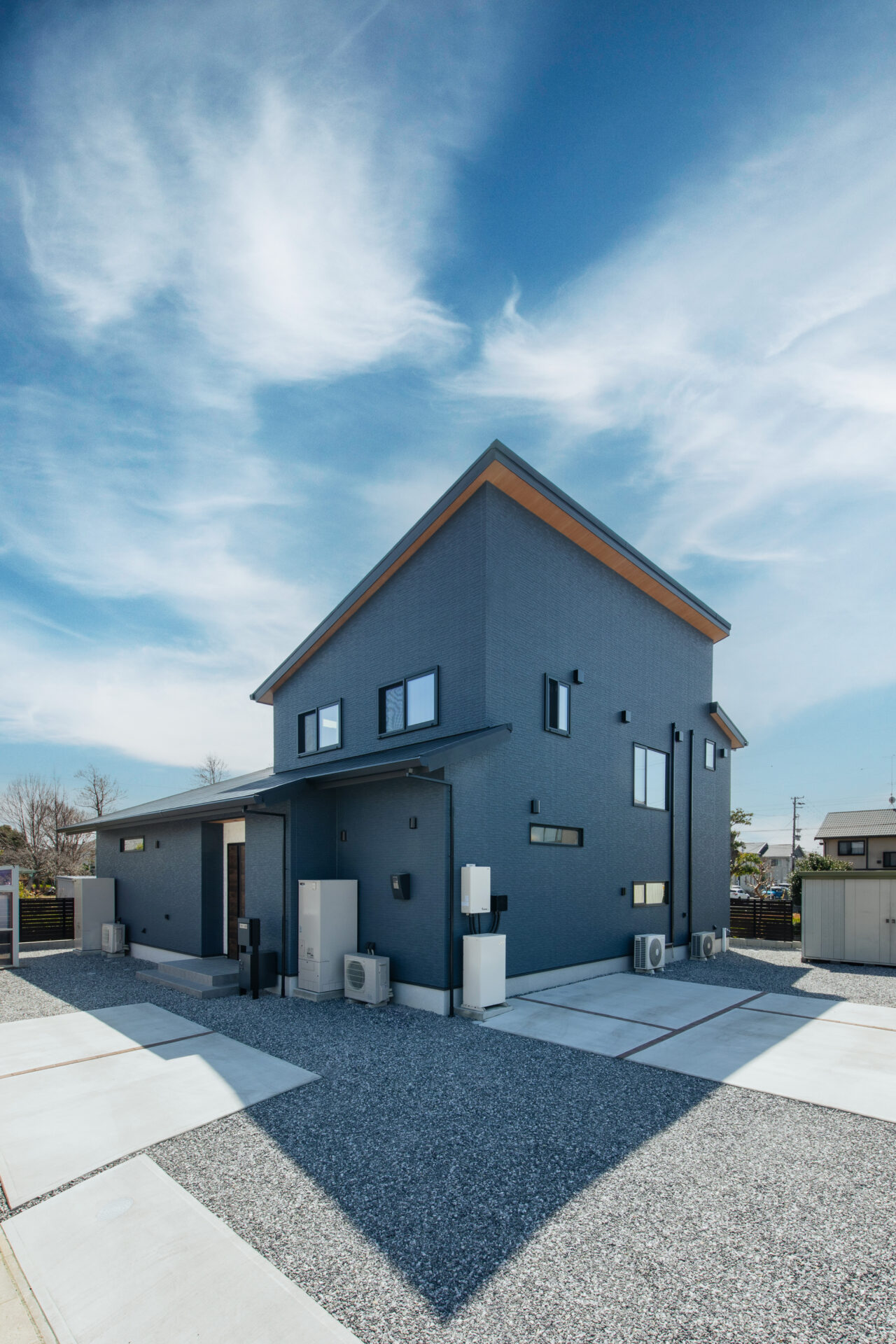 グレーの外壁に木目がアクセントになった外観デザイン。二階建てと平屋が組み合わせられた大らかさを感じるプロポーションの家です。