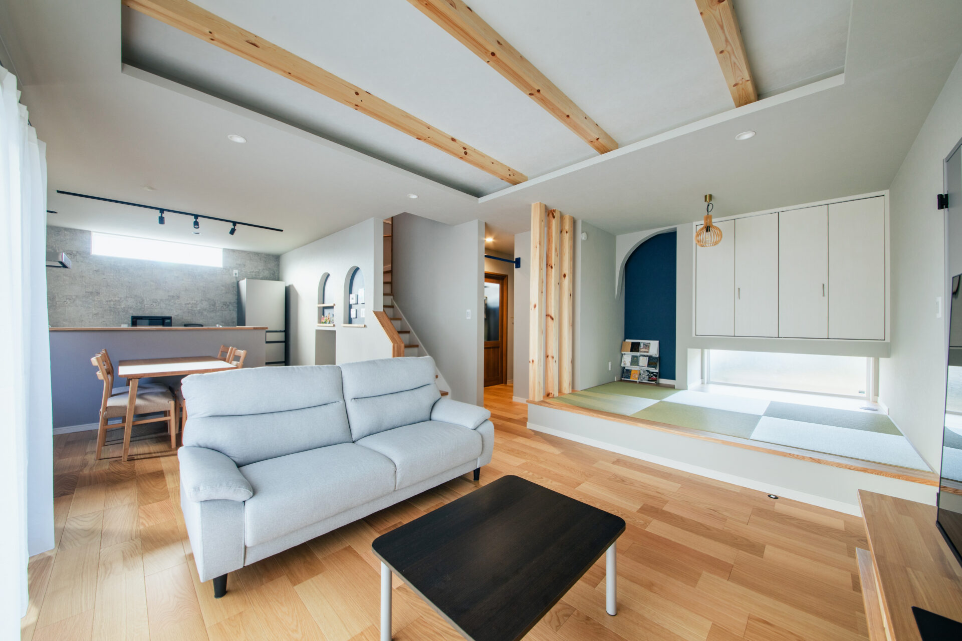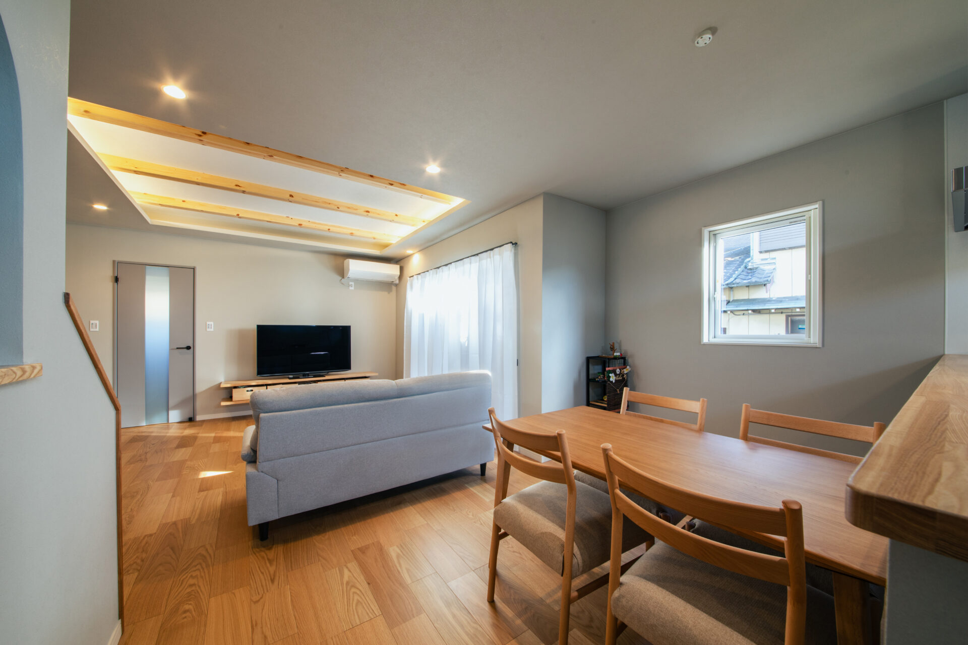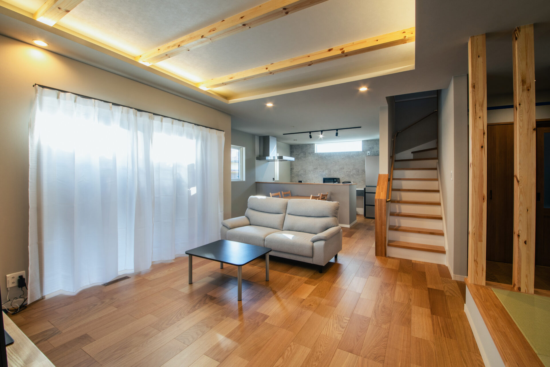 折り上げ天井を採用。グレージュを基本としたインテリアに、化粧柱と化粧梁がアクセントになっています。