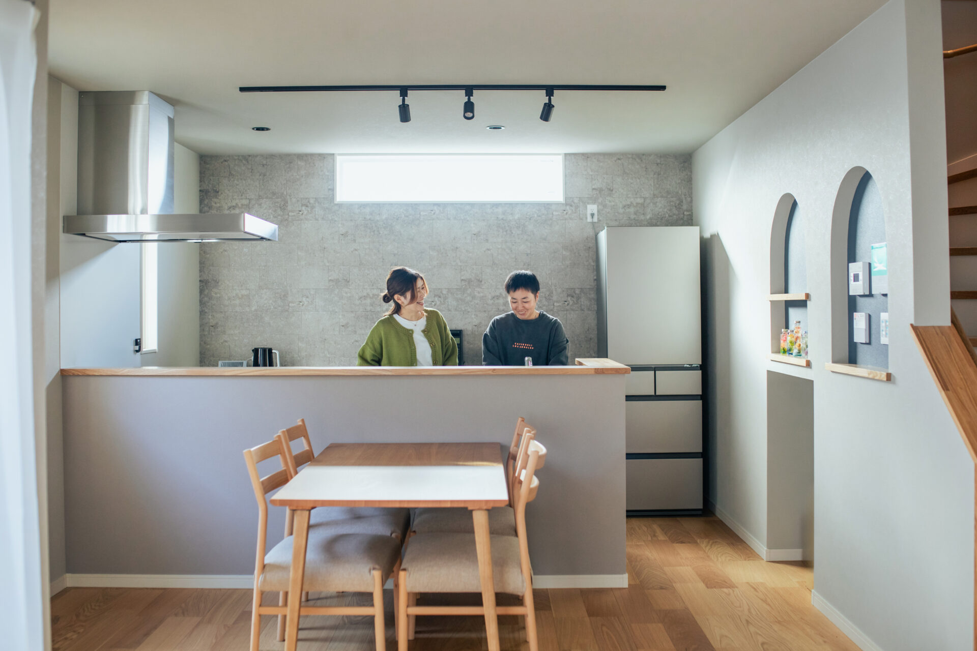 キッチン側から真っ直ぐにテレビがあり、ダイニングにも小窓を付けて、広さを感じて過ごせます。