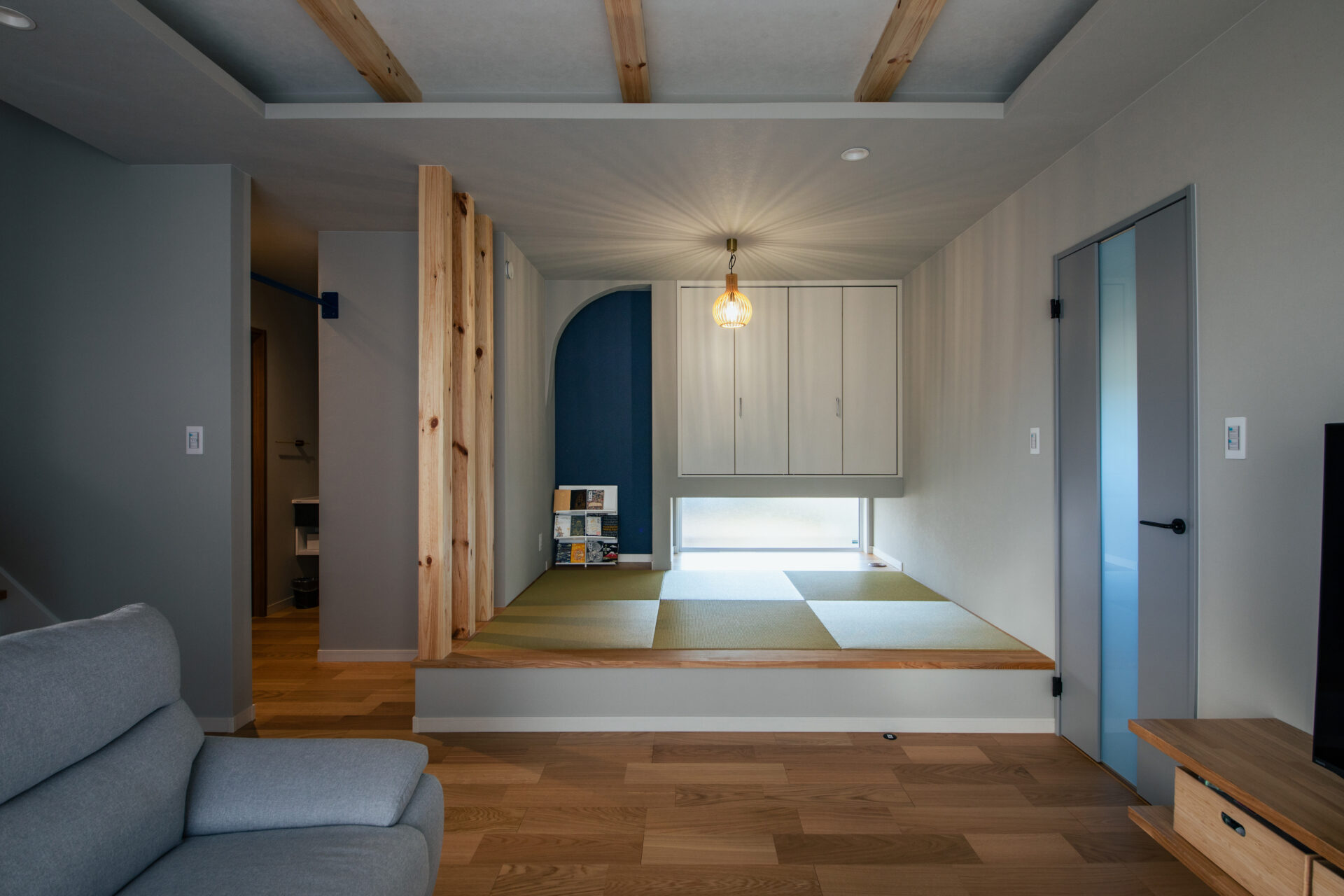 リビングの横にある小上がりの畳スペース。収納とモダンなデザインの床の間も。奥様が選んだ照明を組み合わせています。