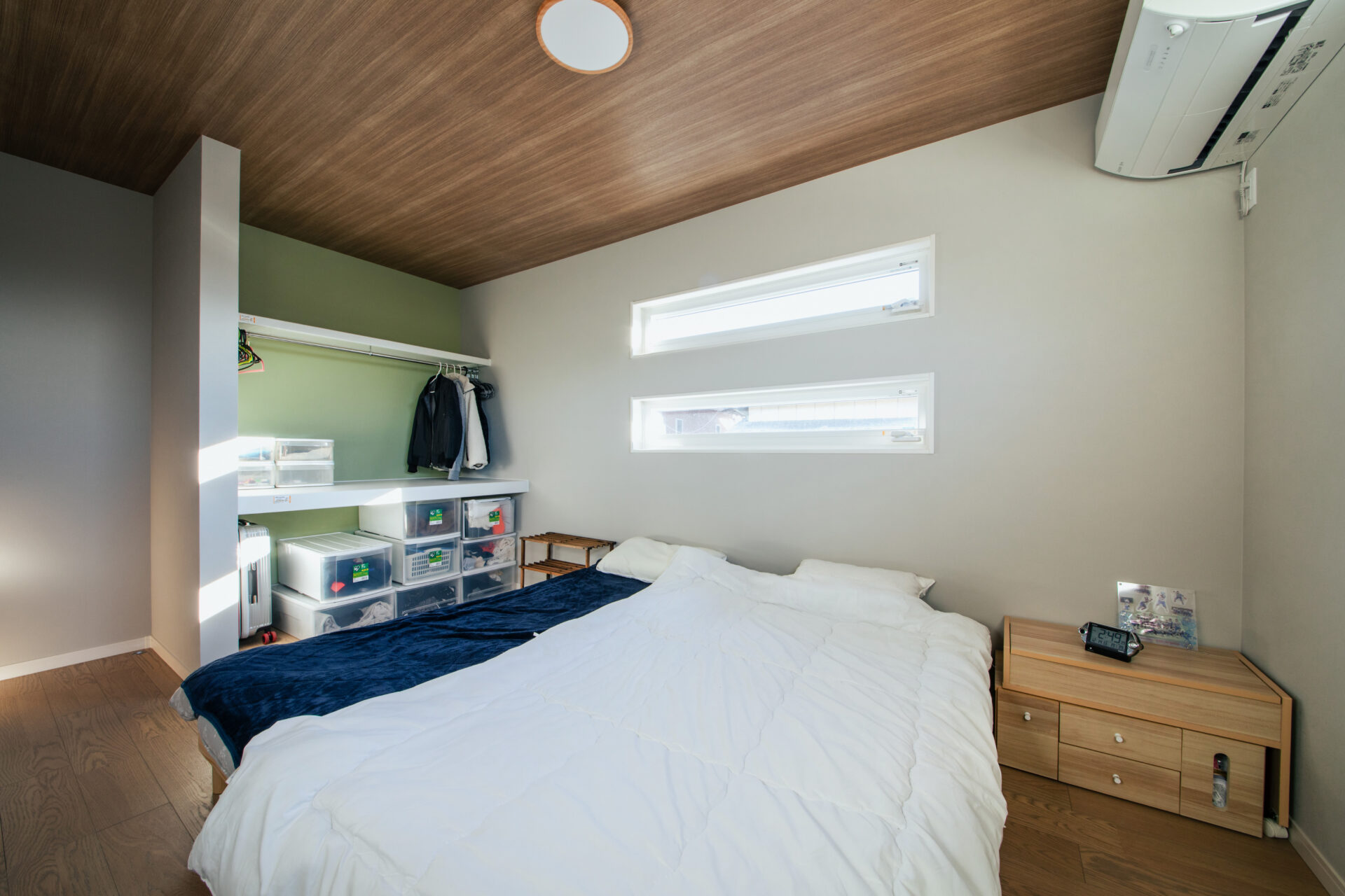 寝室には濃い色の木目のアクセントクロスを天井に。落ち着いた雰囲気に仕上げています。