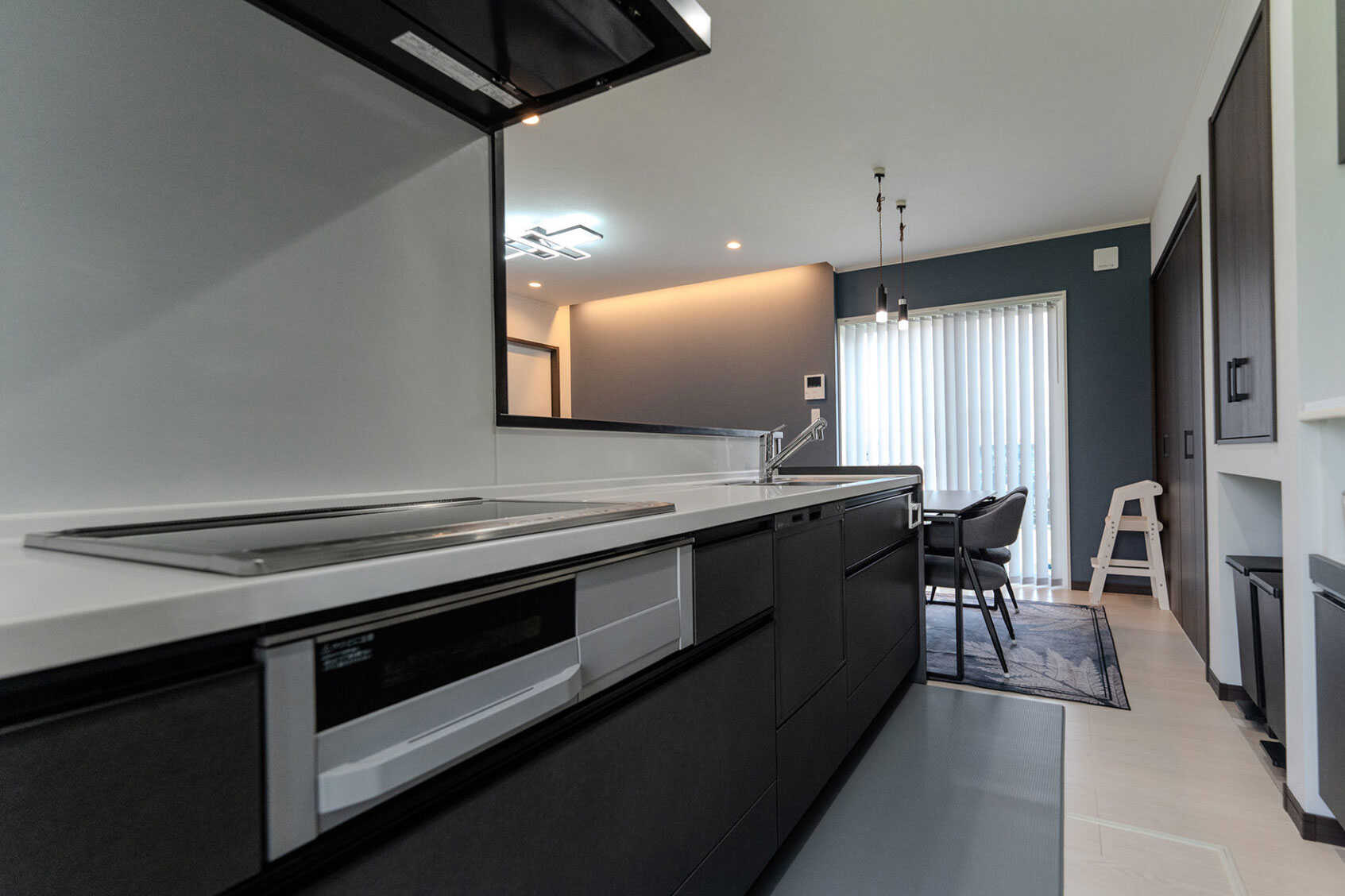 黒で統一されたキッチンとダイニング。生活感を抑えた洗練されたデザインで、暮らしに美しさを添えます。