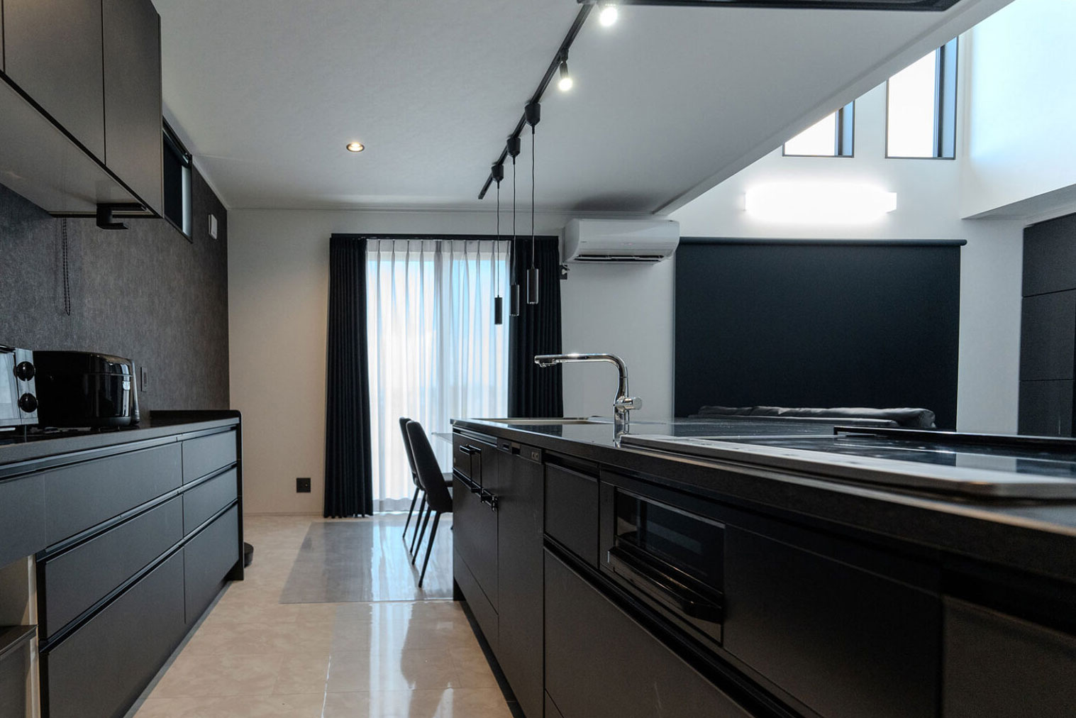 マットブラックで統一されたキッチンは、家全体の世界観と美しくマッチ。使いやすさにも配慮されたアイランド型で、料理が楽しくなる場所に。